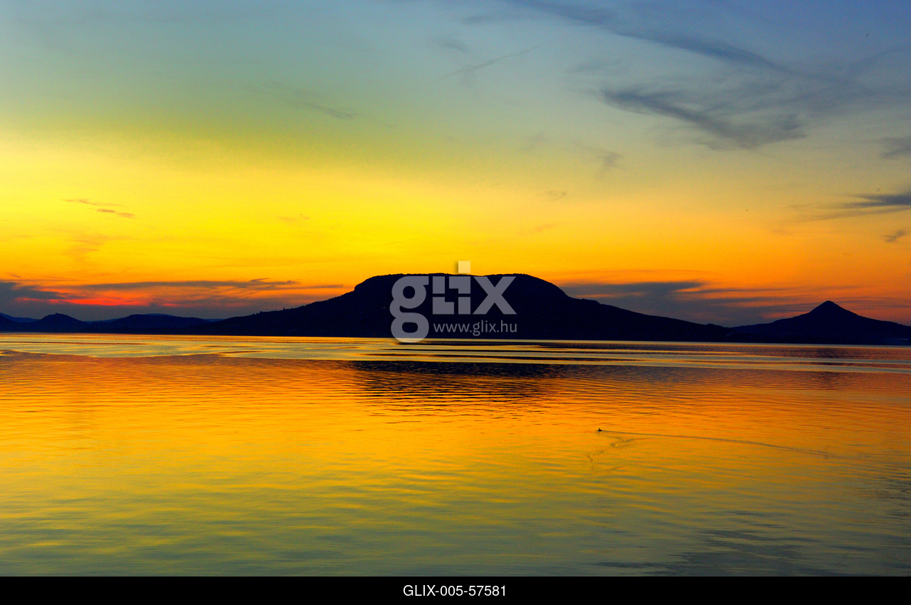 Naplemente Fonyódon, szemben a Badacsony, a Tapolcai-medence legmagasabb tanúhegye.