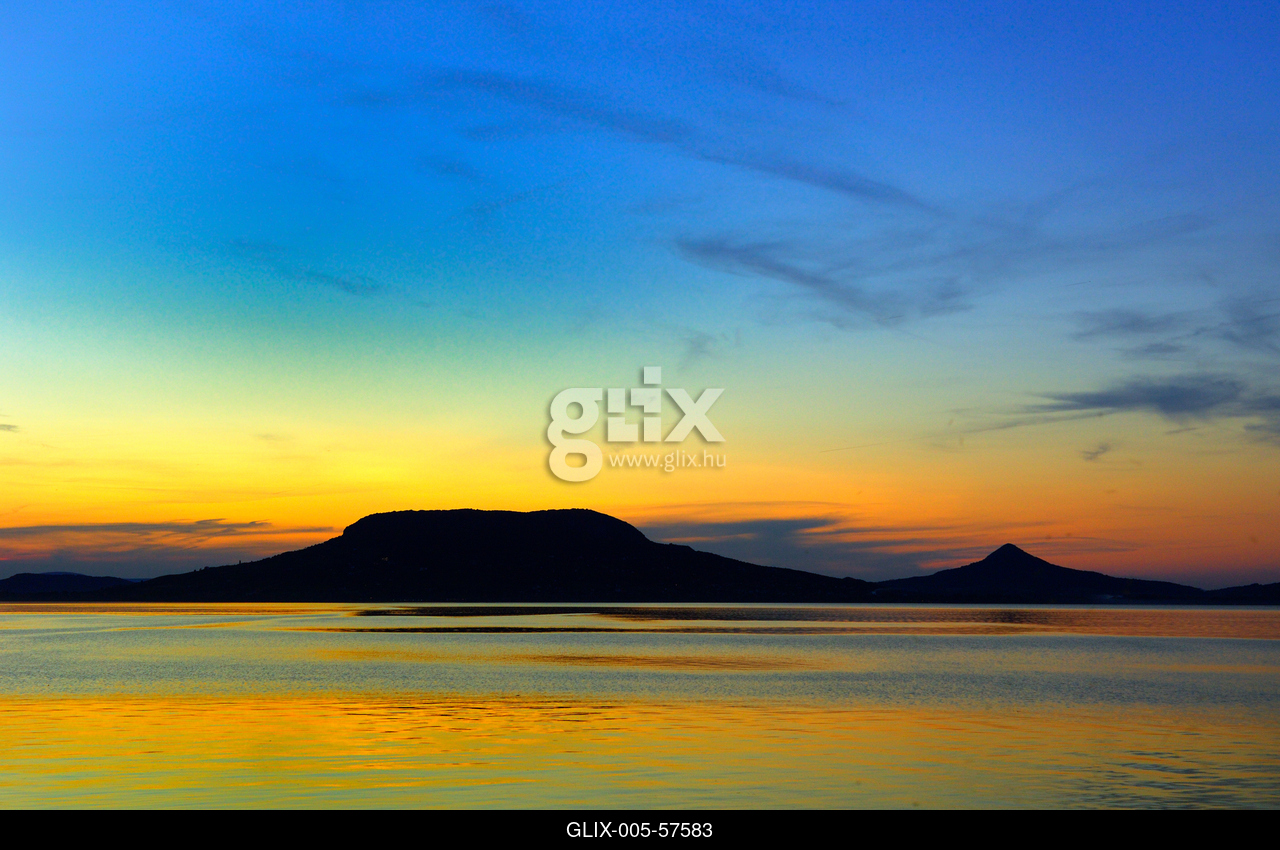 Naplemente Fonyódon, szemben a Badacsony és Tapolcai-medence tanúhegyei.