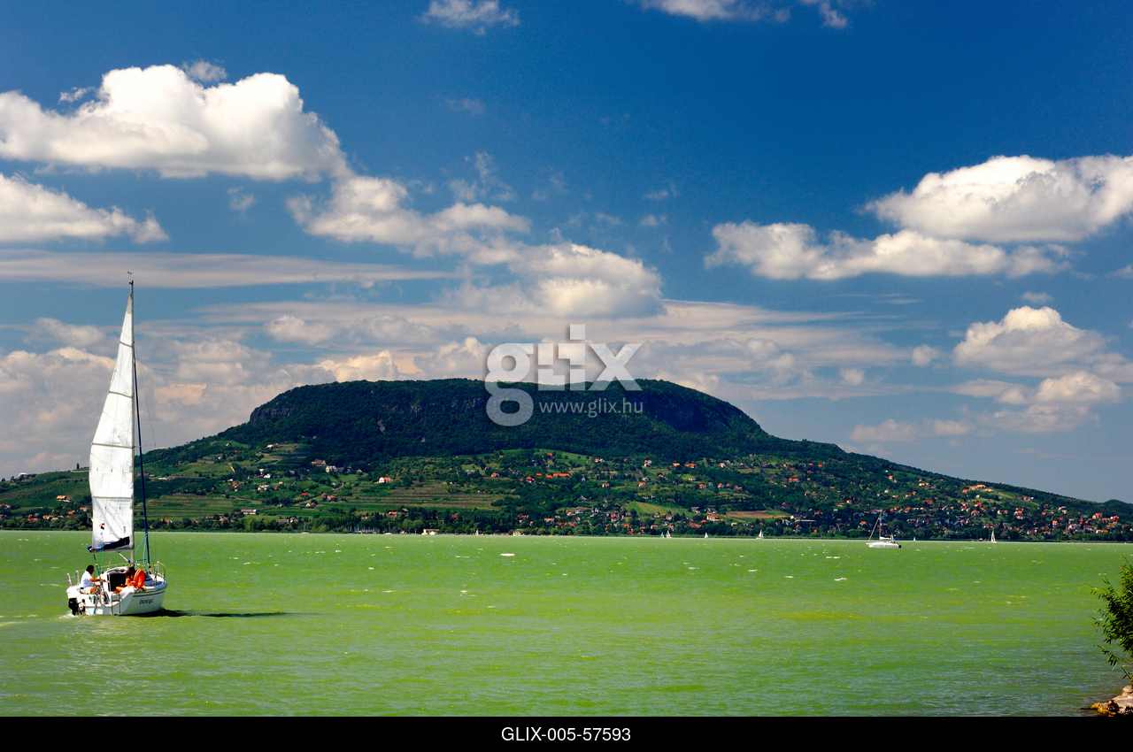 Vitorlás a Balatonon, háttérben a Badacsony melleti tanúhegyek.