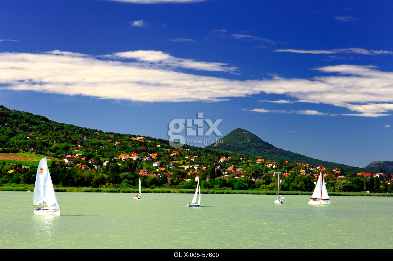 Vitorlások a Balatonon, háttérben a Badacsony melleti tanúhegyek.