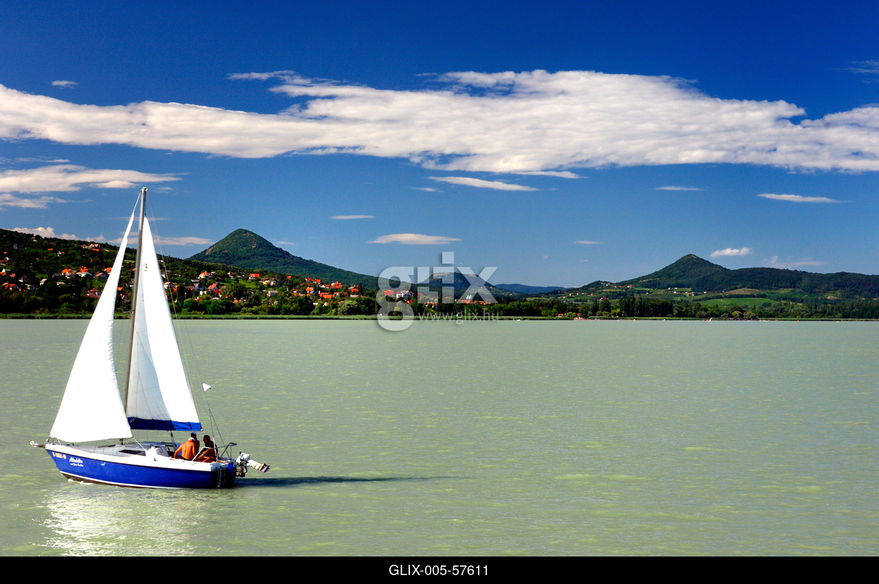 Vitorlás a Balatonon, háttérben a Badacsony melleti tanúhegyek.