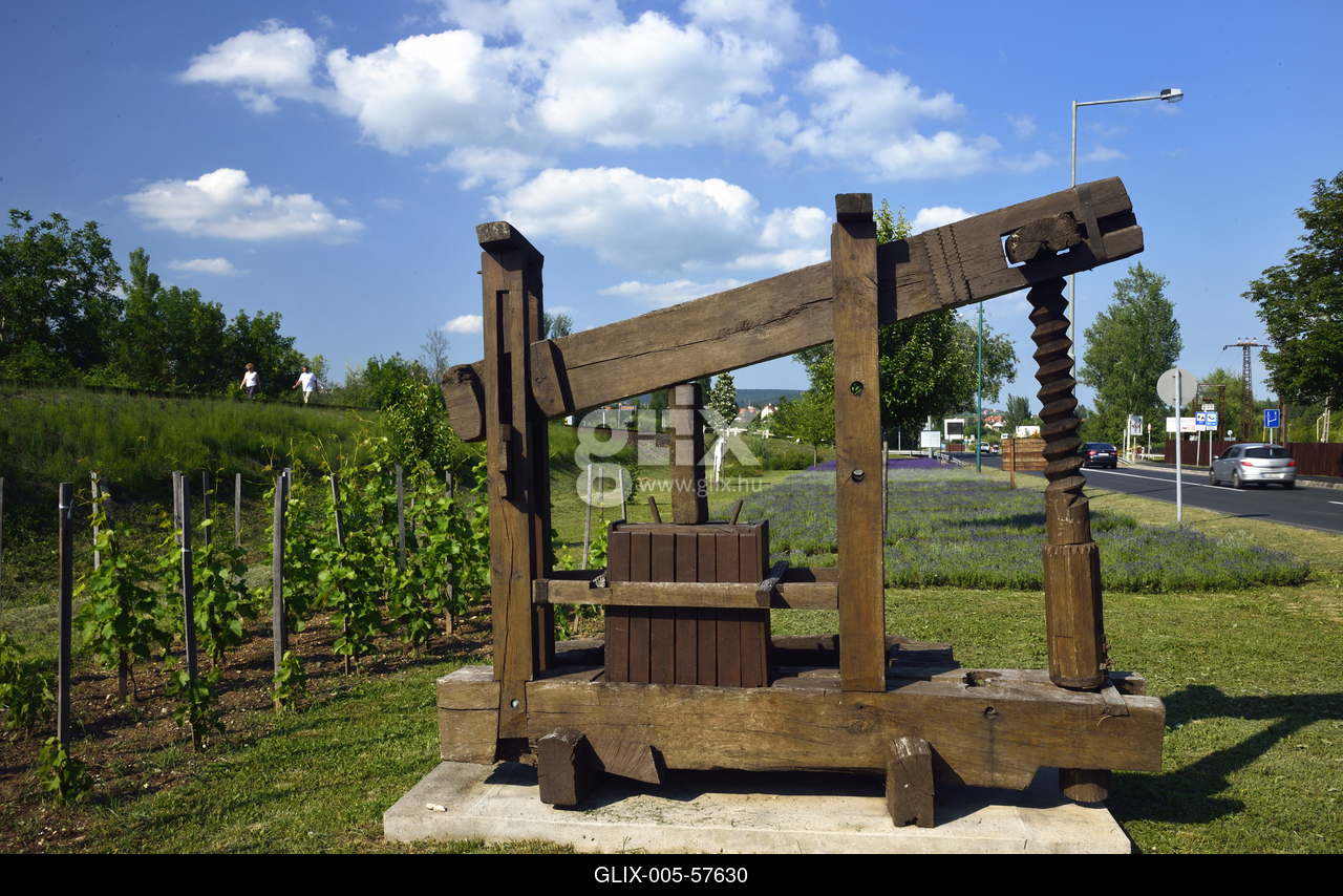 Virágzó levendula és régi szőlőprés Alsóörsön.