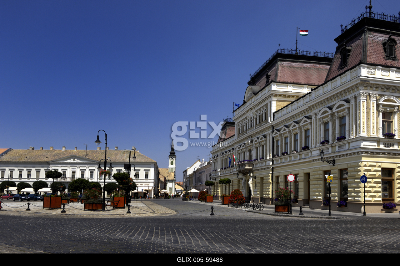 Baja város főtere, a Szentháromság tér. Jobbra a jelenleg a Városházának otthont adó Grassalkovich-kastély vagy palota (teljes nevén: Patasich–Grassalkovich–(Horváth)–Viczay–Zichy-Ferraris-kastély).