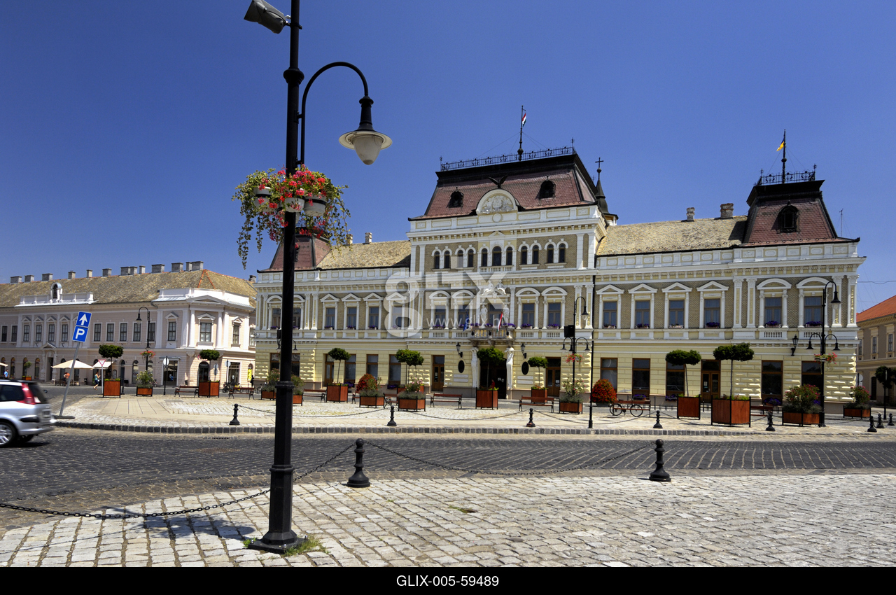 Baja város főtere, a Szentháromság tér. Háttérben a jelenleg a Városházának otthont adó Grassalkovich-kastély vagy palota (teljes nevén: Patasich–Grassalkovich–(Horváth)–Viczay–Zichy-Ferraris-kastély).