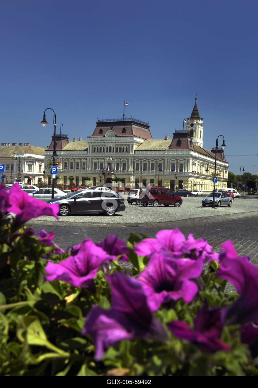 Baja város főtere, a Szentháromság tér. Háttérben a jelenleg a Városházának otthont adó Grassalkovich-kastély vagy palota (teljes nevén: Patasich–Grassalkovich–(Horváth)–Viczay–Zichy-Ferraris-kastély).