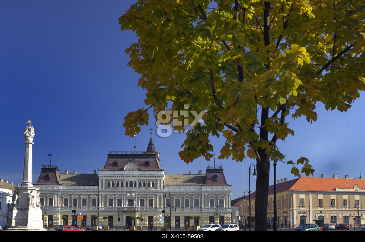 Baja város főtere, a Szentháromság tér. Balra a Szentháromság-szobor, háttérben jobbra a jelenleg a Városházának otthont adó Grassalkovich-kastély vagy palota (teljes nevén: Patasich–Grassalkovich–(Horváth)–Viczay–Zichy-Ferraris-kastély).