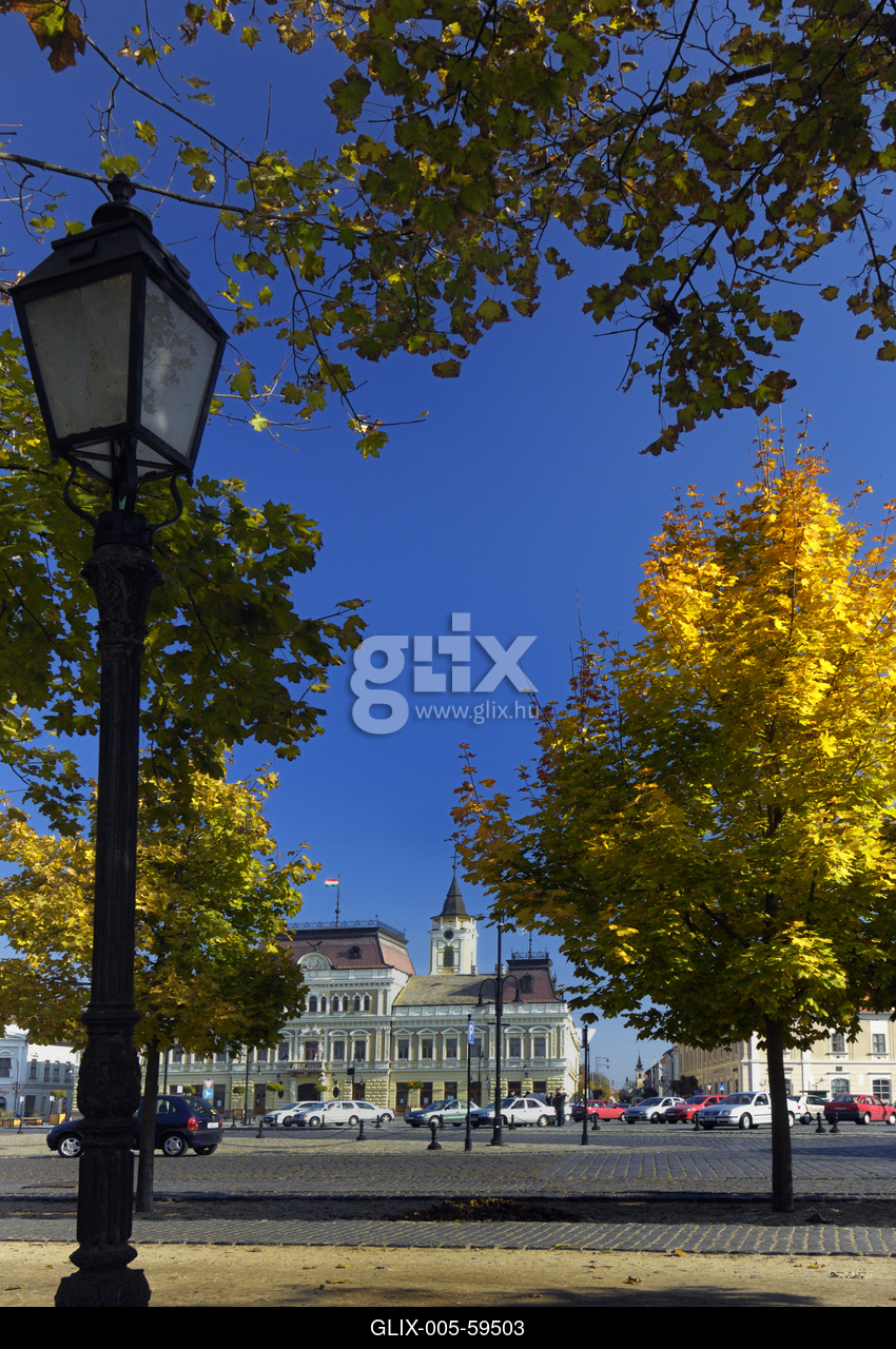Baja város főtere, a Szentháromság tér. A háttérben a jelenleg a Városházának otthont adó Grassalkovich-kastély vagy palota (teljes nevén: Patasich–Grassalkovich–(Horváth)–Viczay–Zichy-Ferraris-kastély).