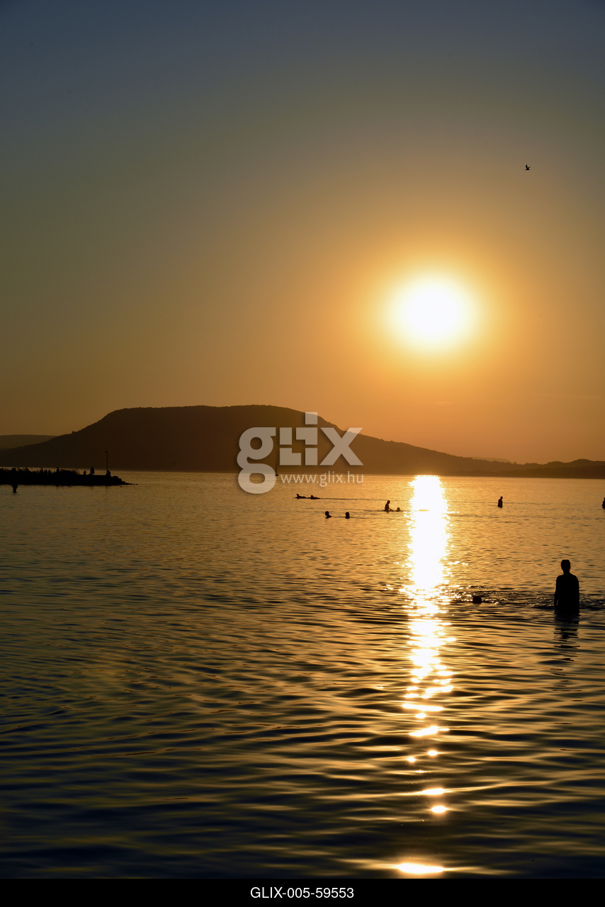Naplemente a Balatonon, háttérben a Badacsony.