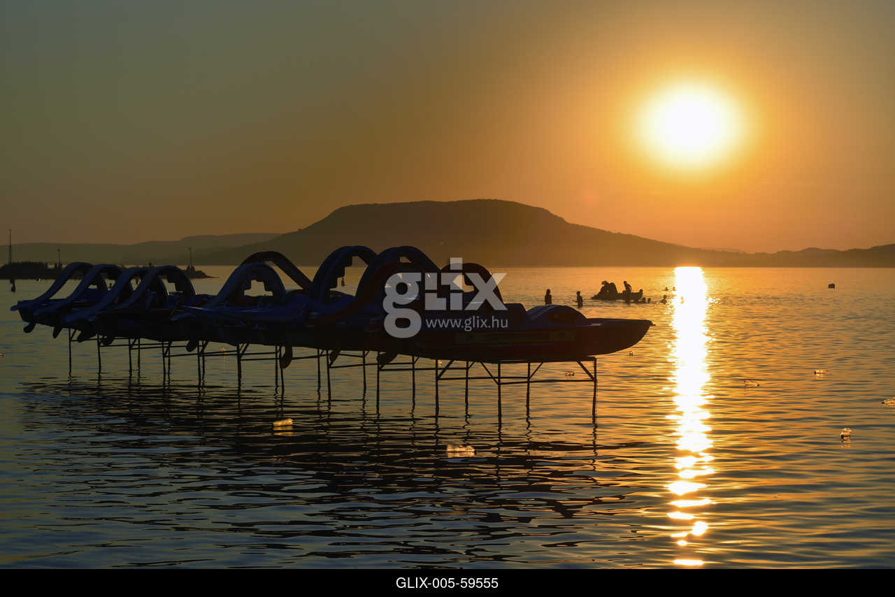 Naplemente a Balatonon, háttérben a Badacsony.