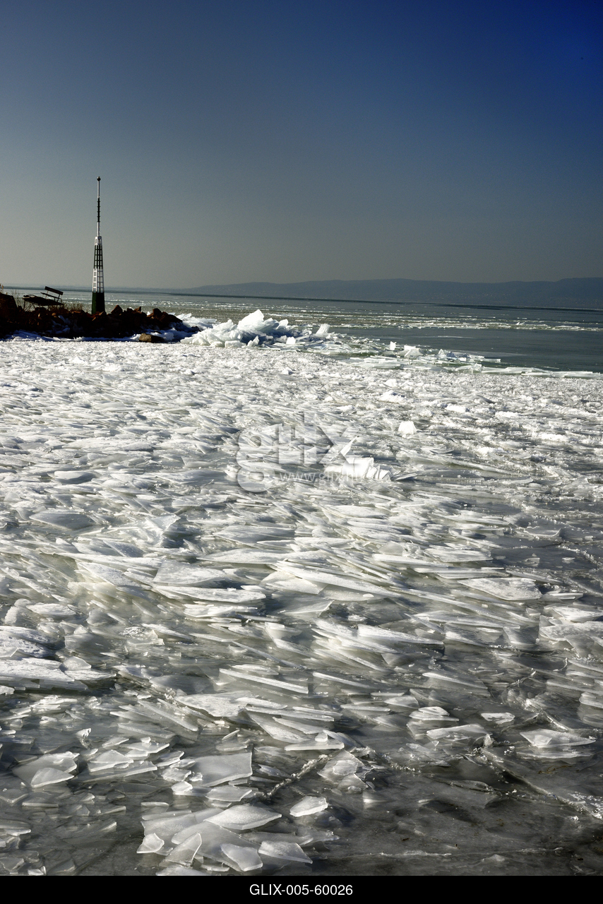 Fonyód, feltorlódott jégtáblák a Balatonon.