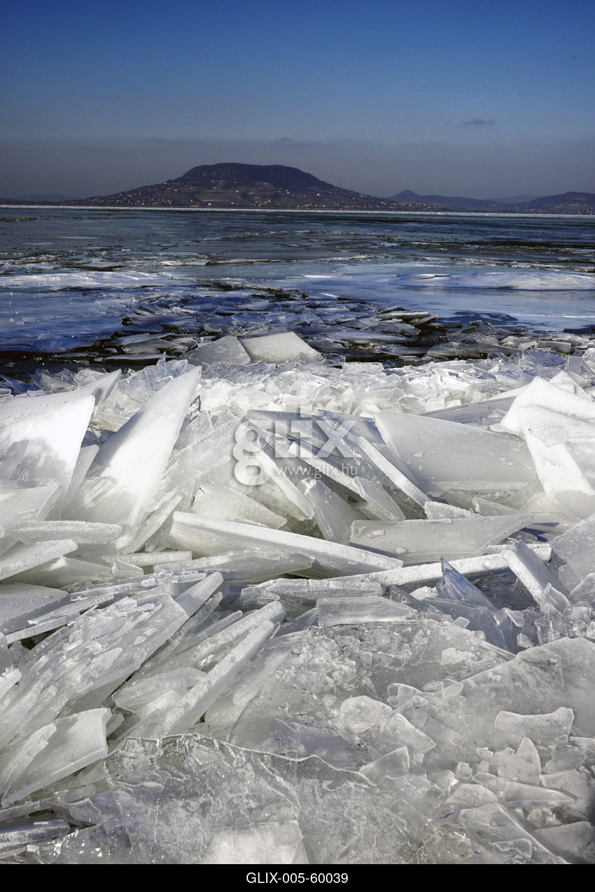 Balatonfenyves, feltorlódott jégtáblák a Balatonon.