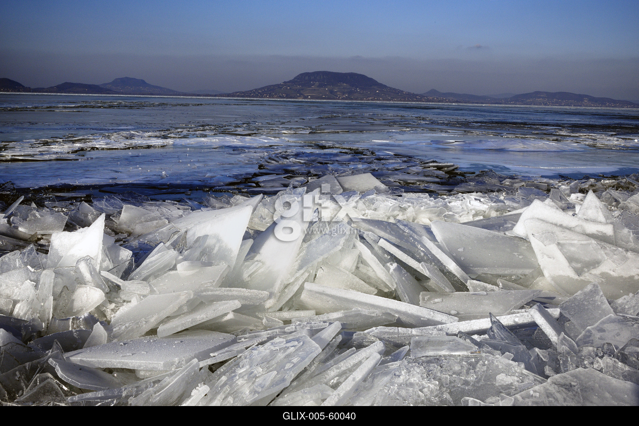 Balatonfenyves, feltorlódott jégtáblák a Balatonon.