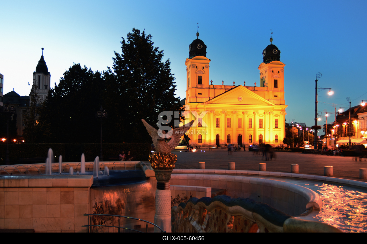 Főnix szökőkút a Kossuth téren, háttérben a Református Nagytemplom.