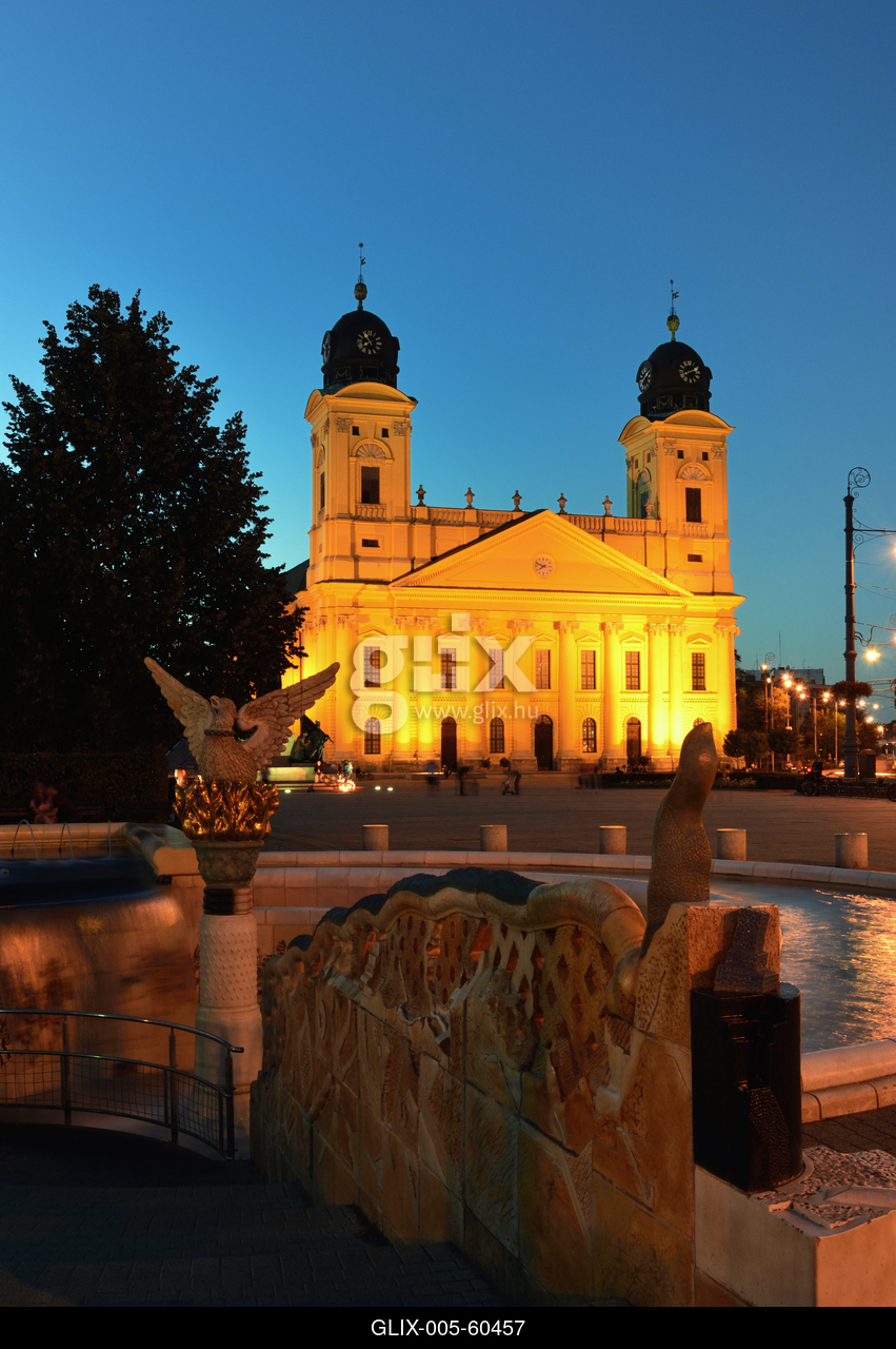 Főnix szökőkút a Kossuth téren, háttérben a Református Nagytemplom.