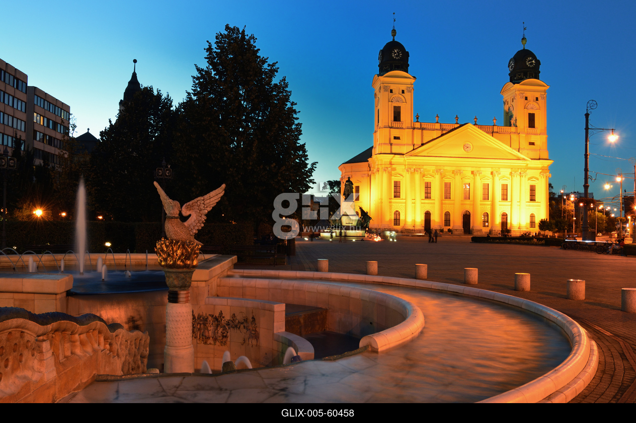 Főnix szökőkút a Kossuth téren, háttérben a Református Nagytemplom.
