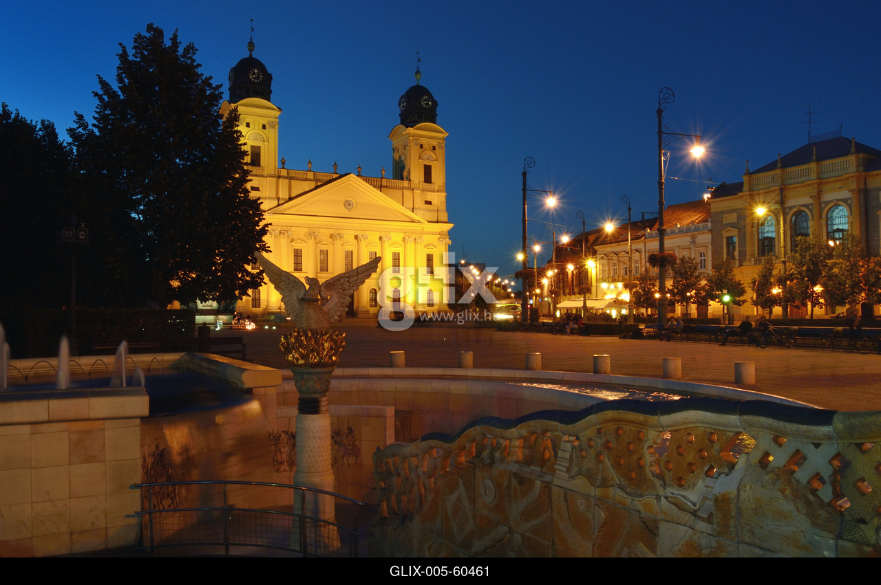 Főnix szökőkút a Kossuth téren, háttérben a Református Nagytemplom.
