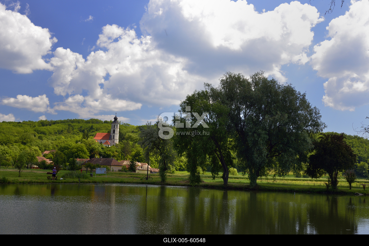 A cserhátsurányi horgásztó, háttérben a római katolikus templom.
