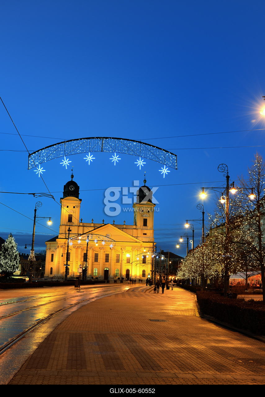 Karácsonyi díszkivilágítás a Kossuth téren, háttérben a Református Nagytemplom.