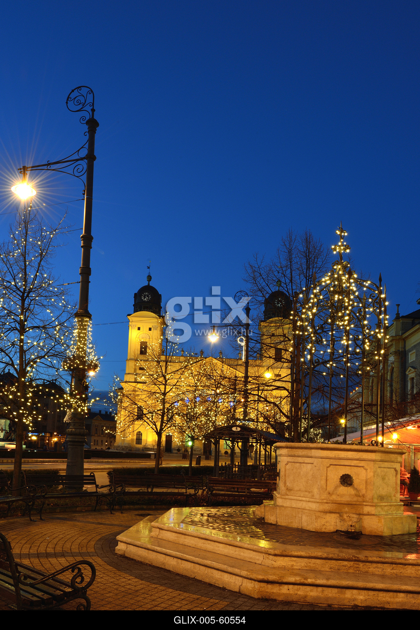 Karácsonyi díszkivilágítás a Kossuth téren, háttérben a Református Nagytemplom.