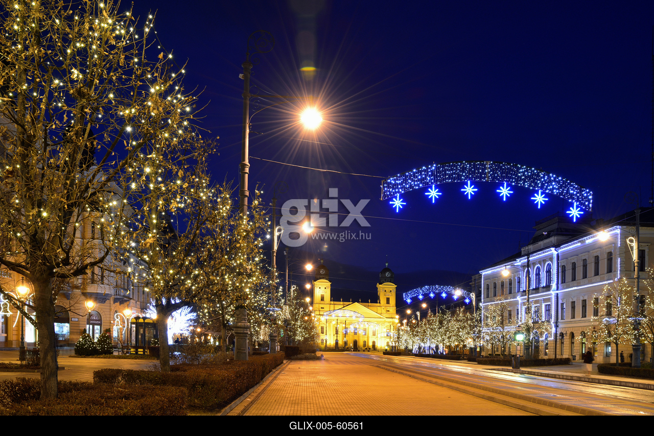 Karácsonyi díszkivilágítás Debrecen belvárosában, háttérben a Református Nagytemplom.