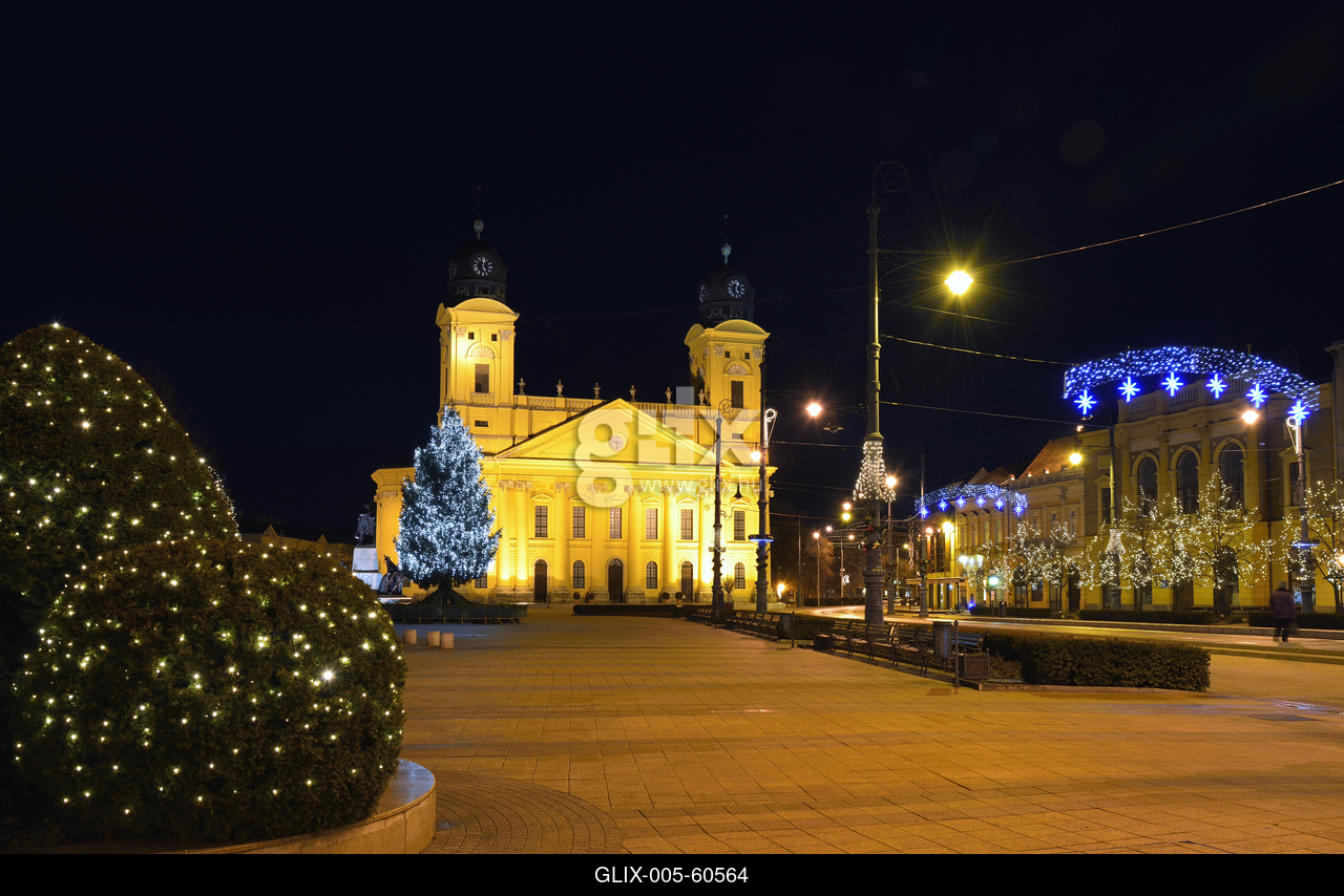 Karácsonyi díszkivilágítás a Kossuth téren, háttérben a Református Nagytemplom.