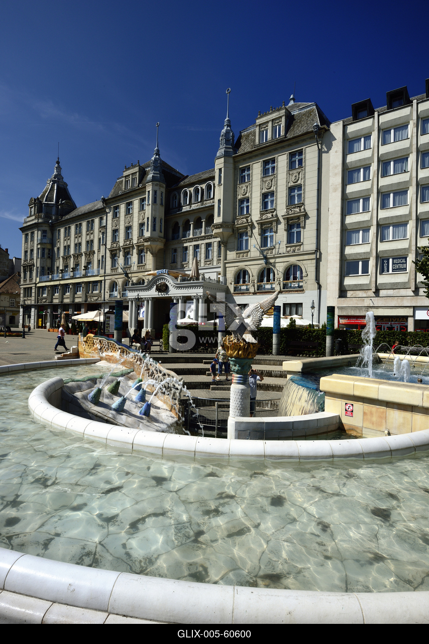 Főnix szökőkút a Kossuth téren, háttérben az Aranybika Szálloda.