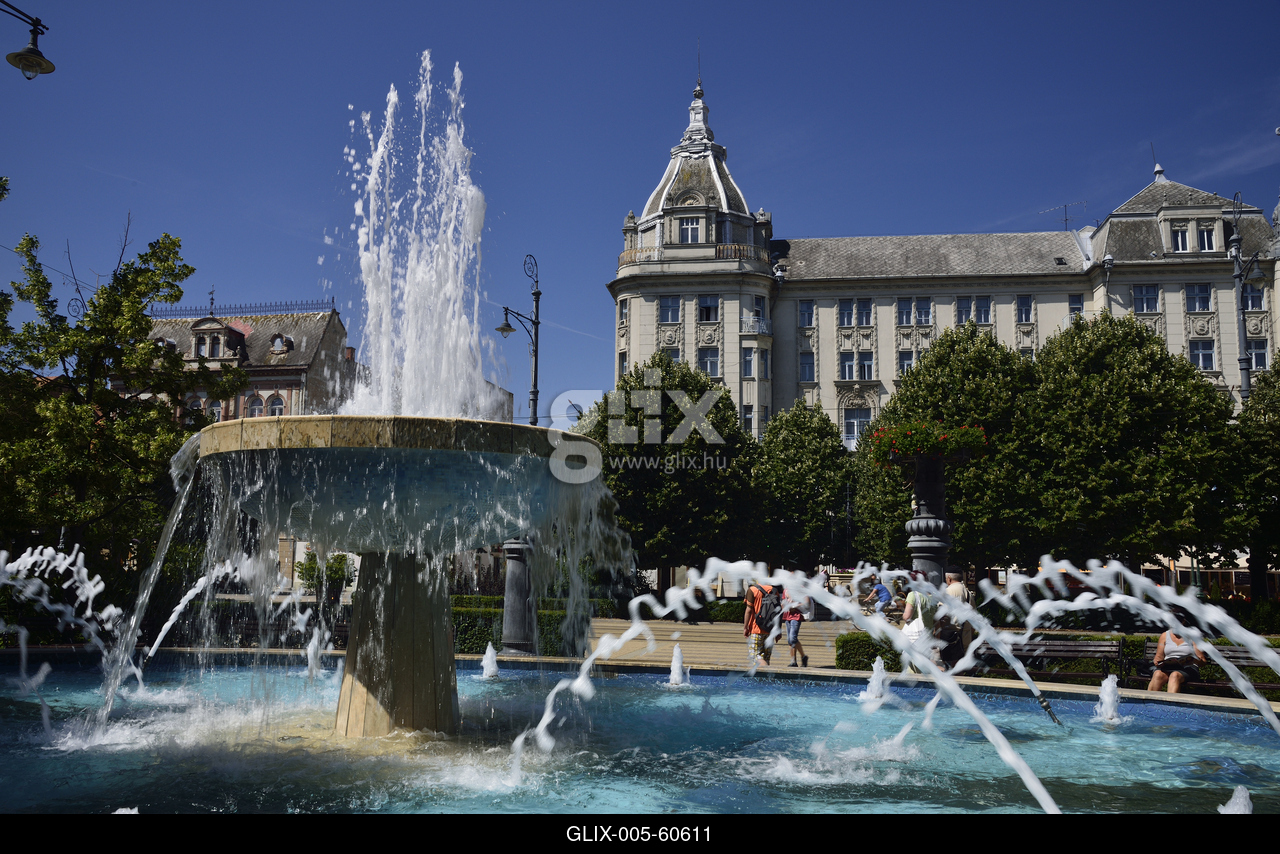 Szökőkút a Kossuth téren, háttérben az Aranybika Szálloda.
