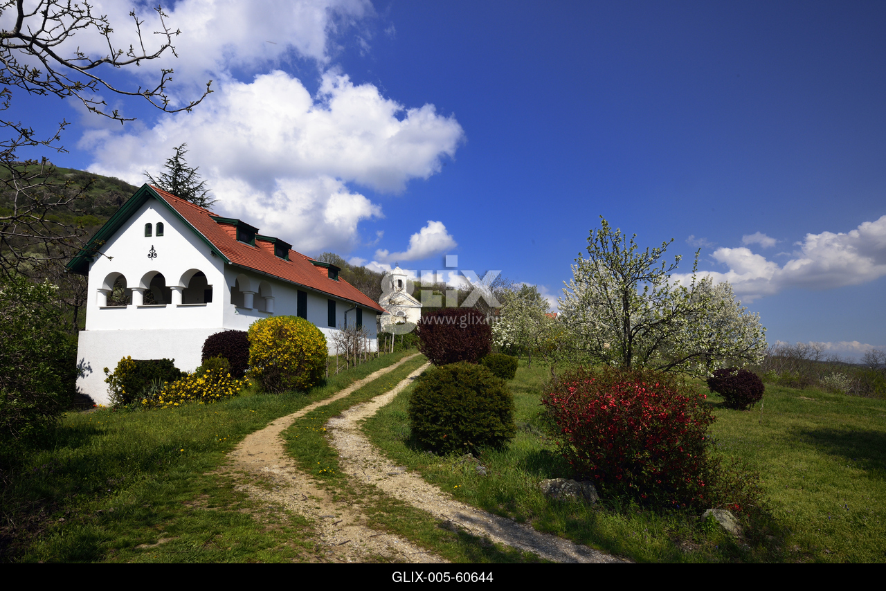 Présház és háttérben a Szent Donát kápolna a Csobánc hegy oldalában.