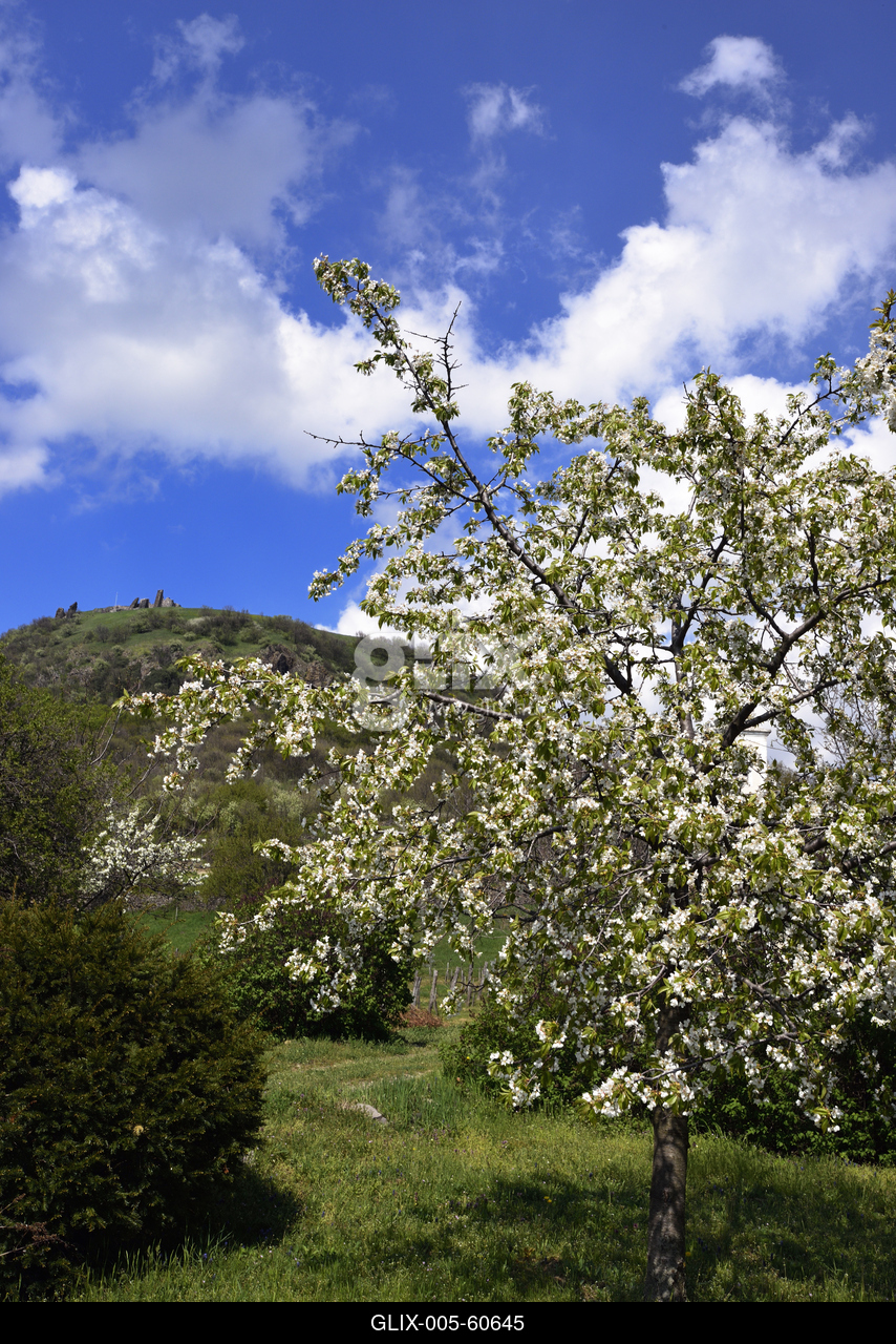 Balaton-felvidéki táj tavasszal, háttérben Csobánc vára.