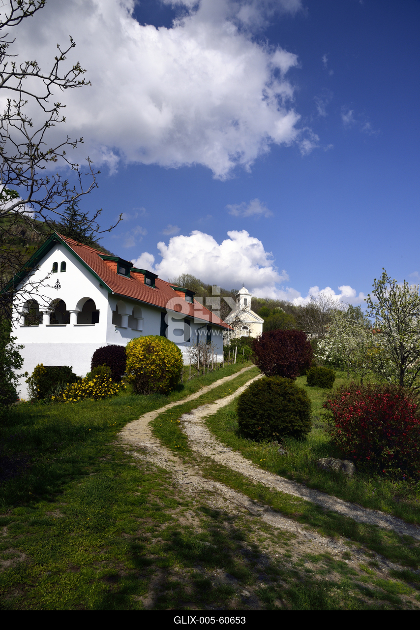 Présház és háttérben a Szent Donát kápolna a Csobánc hegy oldalában.