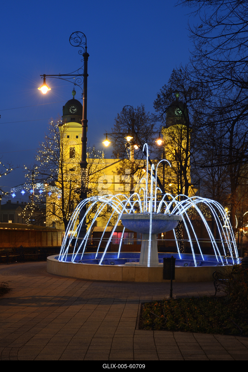Karácsonyi díszkivilágítás a Kossuth téren, háttérben a Református Nagytemplom.