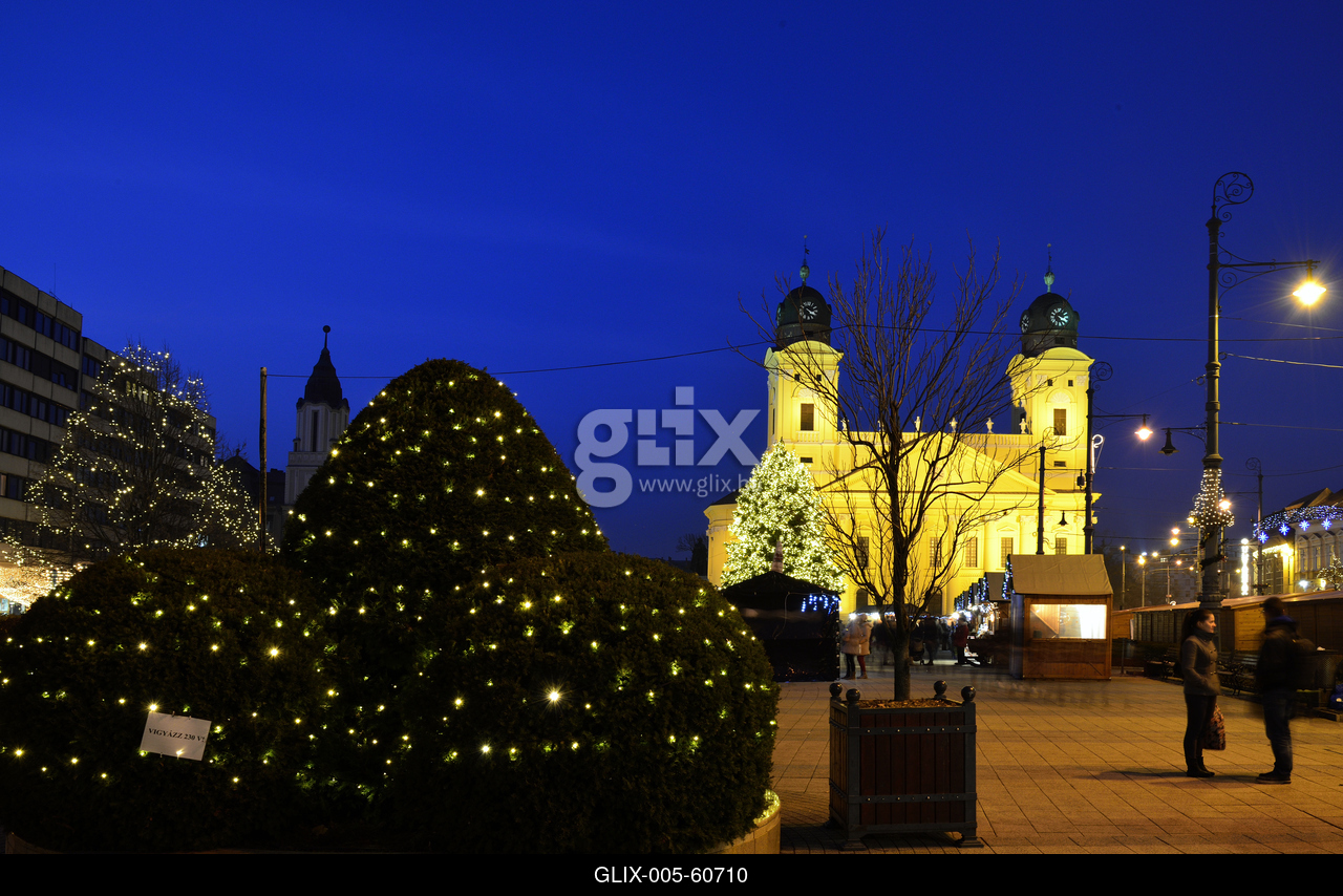 Karácsonyi díszkivilágítás a Kossuth téren, háttérben a Református Nagytemplom.