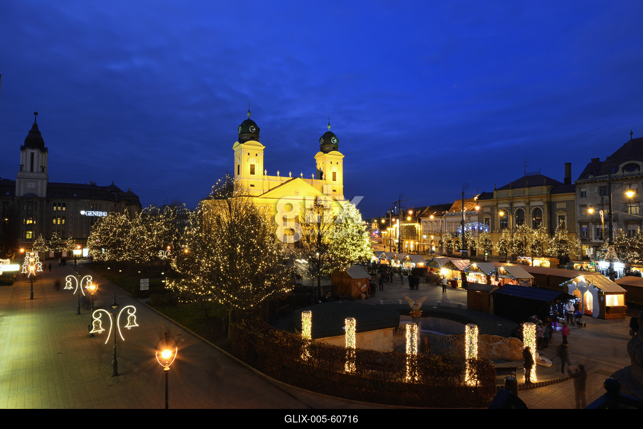 Karácsonyi díszkivilágítás a Kossuth téren, háttérben a Református Nagytemplom.