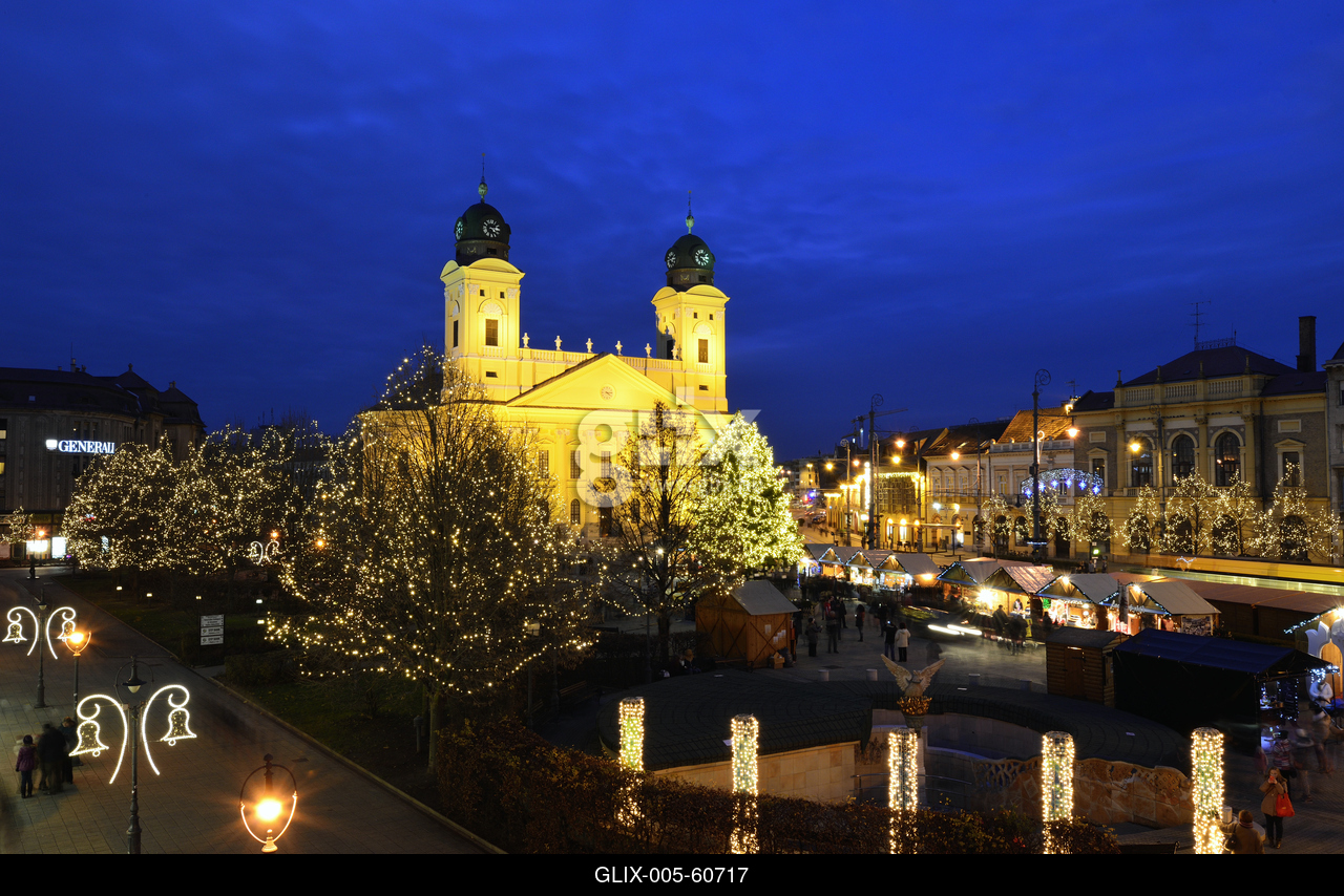 Karácsonyi díszkivilágítás a Kossuth téren, háttérben a Református Nagytemplom.