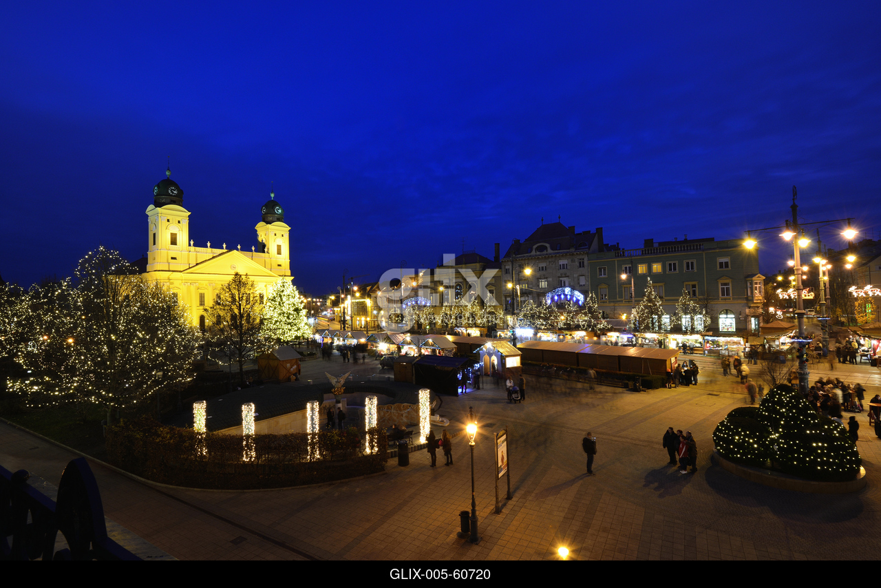 Karácsonyi díszkivilágítás a Kossuth téren, háttérben a Református Nagytemplom.