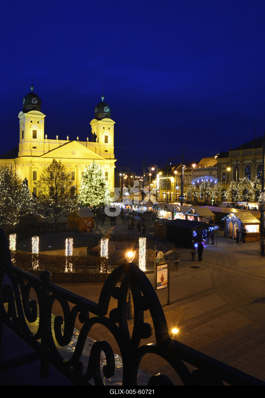 Karácsonyi díszkivilágítás a Kossuth téren, háttérben a Református Nagytemplom.