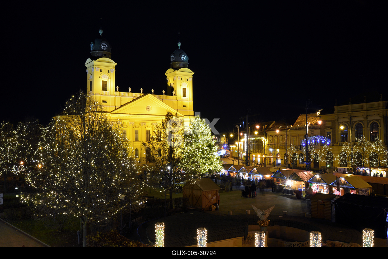 Karácsonyi díszkivilágítás a Kossuth téren, háttérben a Református Nagytemplom.