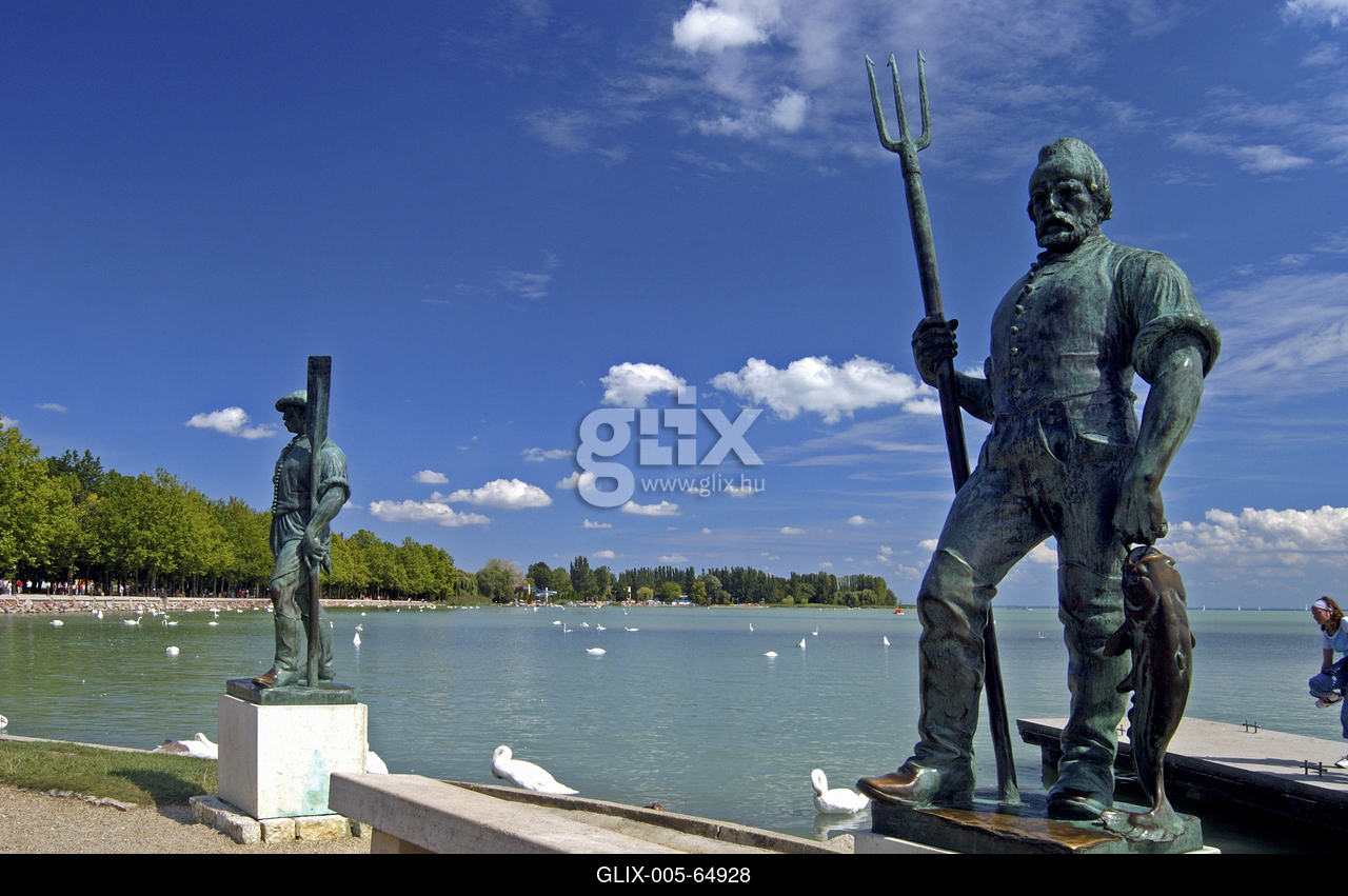 Balatonfüred, a halász és a révész szobra a mólón, a füredi hajókikötőben.