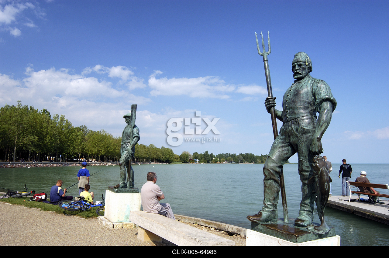 Balatonfüred, a halász és a révész szobra a mólón, a füredi hajókikötőben.