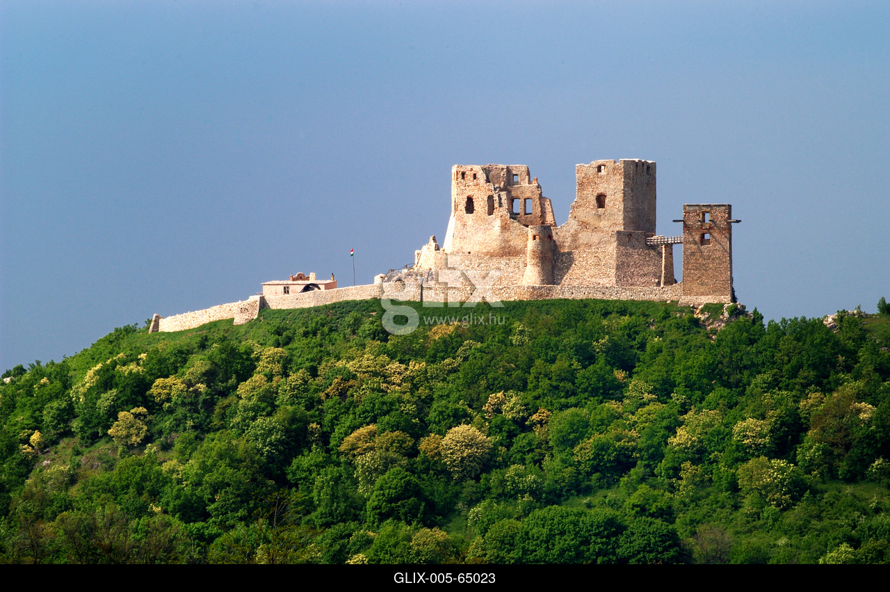 A Csesznek község felett található középkori vár - Cseszneki Vár - látványa a Bakony hegységben.