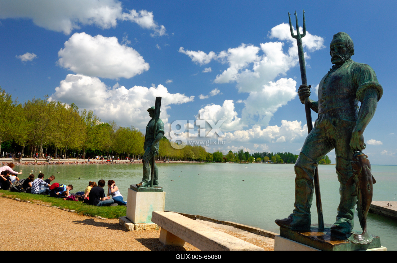 Balatonfüred, a halász és a révész szobra a füredi hajókikötőben.