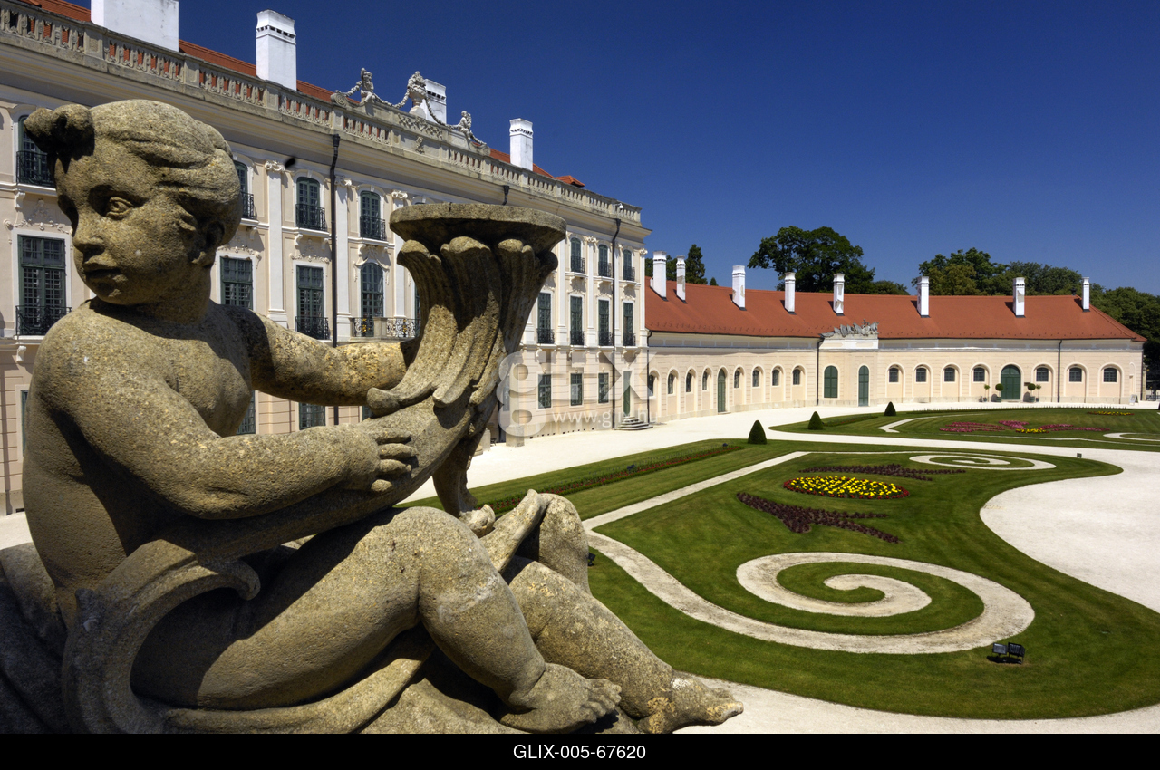 A fertődi Esterházy-kastély barokk épületegyüttese. Mai formáját a 18. század második felében nyerte el. „Magyar Versailles”-nak is nevezik. Lámpást tartó puttó az első emeleti erkélyhez vezető díszlépcső korlátján.