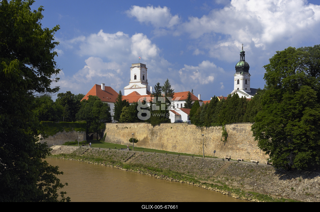 A Püspökvár és a Bazilika látképe a Rába folyó partján.