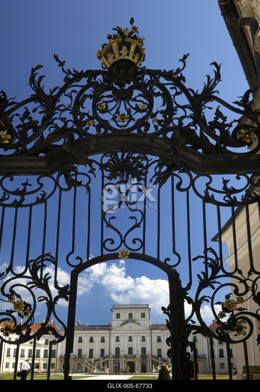 A fertődi Esterházy-kastély barokk épületegyüttese. Mai formáját a 18. század második felében nyerte el. „Magyar Versailles”-nak is nevezik. A háromnyílású kovácsoltvas kapu