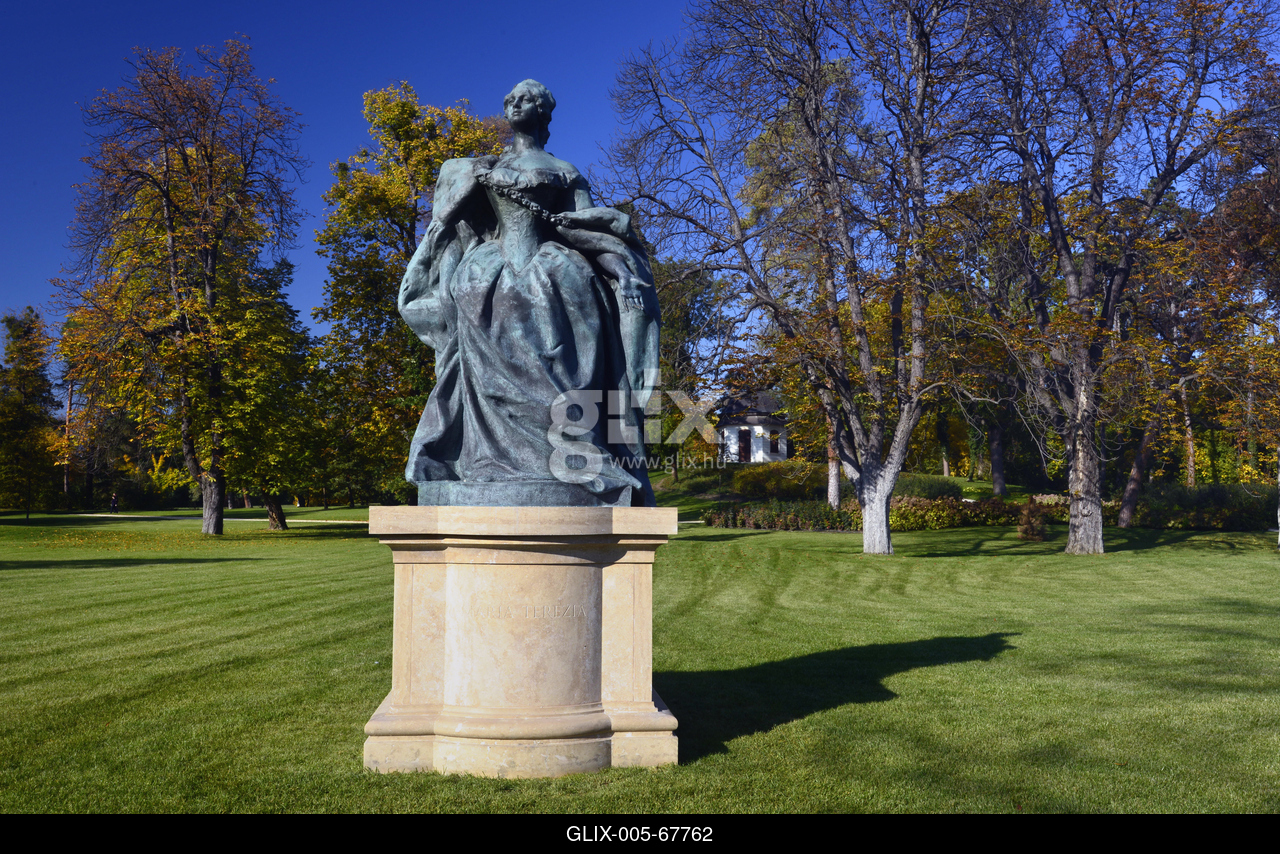A kastélypark. A korábbi franciakertet Grassalkovics III. Antalné Esterházy Leopoldina alakíttatta át angolparkká. Mária Terézia királynő egész alakos bronzszobra, háttérben a királydombi pavilon.
