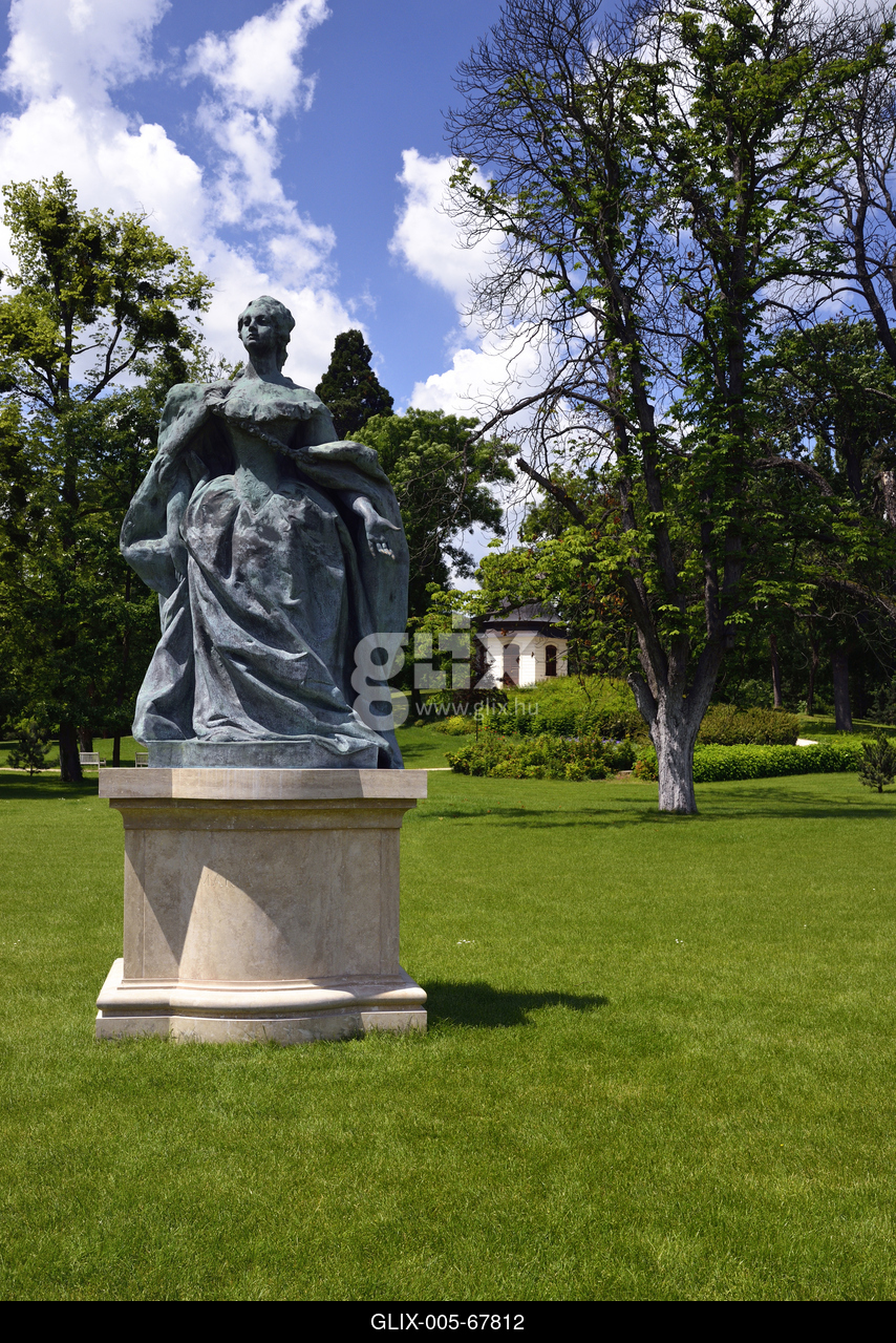 A kastélypark. A korábbi franciakertet Grassalkovics III. Antalné Esterházy Leopoldina alakíttatta át angolparkká. Mária Terézia királynő egész alakos bronzszobra, háttérben a királydombi pavilon.