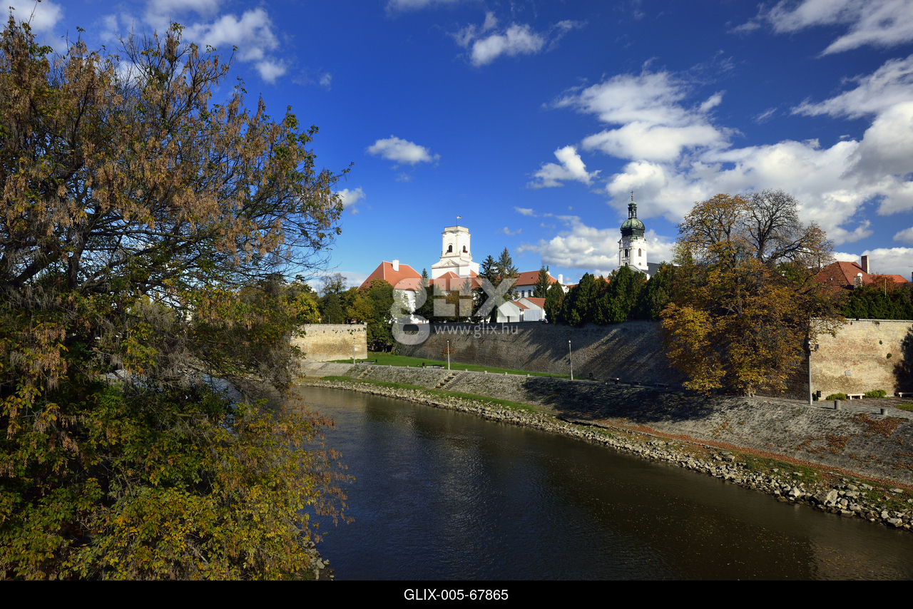 A Püspökvár és a Bazilika látképe a Rába folyó partján.