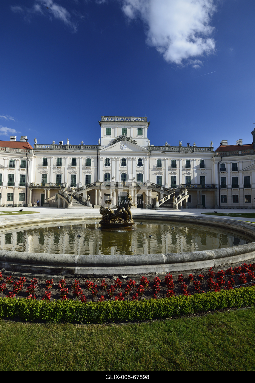 A fertődi Esterházy-kastély barokk épületegyüttese. Mai formáját a 18. század második felében nyerte el. „Magyar Versailles”-nak is nevezik. A díszudvar a szökőkúttal.