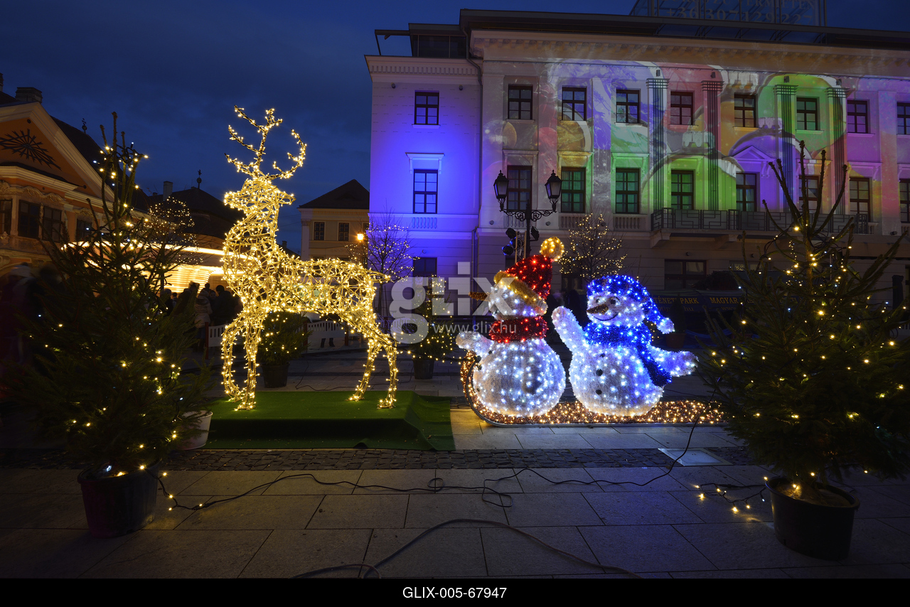 Karácsonyi díszkivilágítás a Széchenyi téren a város barokk főterén. Háttérben a Lloyd palota.