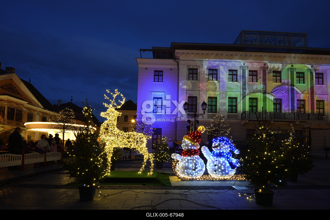 Karácsonyi díszkivilágítás a Széchenyi téren a város barokk főterén. Háttérben a Lloyd palota.